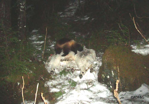 ADF&G biologists and wildlife technicians discovered a dead mountain goat north of Juneau and placed a remote trail camera near the carcass in early spring, drawing eagles and a GPS-collared wolverine. -