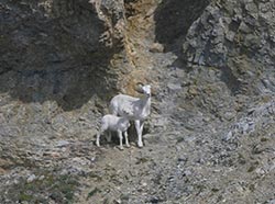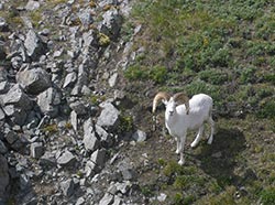 Just past Caribou Creek as you are heading east, use the small pull out on your left and look up towards the cliffs. Dall sheep, both ewes and lambs, are often visible, often low enough on the mountain to be seen without binoculars. The best months for viewing are late May (when new lambs can be seen) through mid-September.