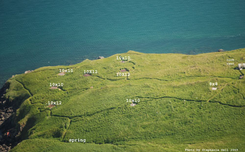 Once you get to Round Island your boat will anchor in Boat Cove, a small relatively unsheltered bay on the north side of the island. Boat Cove is located between several major walrus haul-out areas and it is frequently used by up to 300 walruses as a resting area and travel corridor. Consequently, it is important to minimize your time in the cove and be as quiet as possible while anchored there. Your boat taxi will ferry you and your gear to shore in a small open skiff. You will be stepping off the skiff onto a wet and slippery boulder-strewn beach so rubber knee-high boots are convenient. You should also consider packing your gear in waterproof bags. After unloading, you will carry your gear up a steep trail to the top of an 80-foot high bluff. This can be a difficult climb, so pack your gear in lightweight loads (less than 40 pounds) that you can carry up the trail. The camping area is a short distance from the top of the bluff. The sanctuary staff will inspect your permit, provide you specific instructions on the rules of the sanctuary and help you get settled in the campground.
