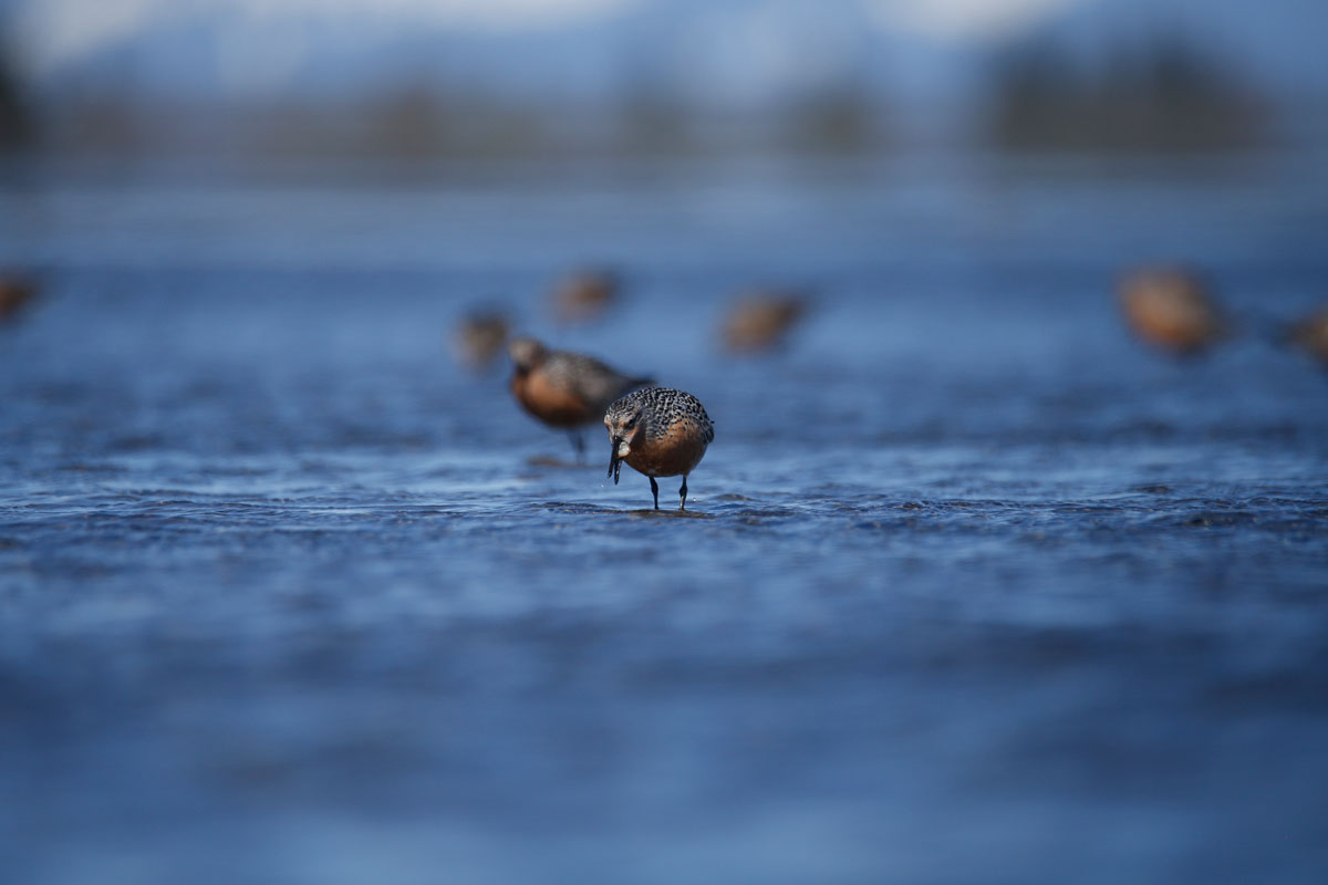 Pacific Red Knots (Calidris canutus roselaari) are a migratory shorebird species that breed in western and northwestern Alaska and overwinter in Mexico. Six subspecies of Red Knots are recognized across the globe, and several are in decline. The Pacific population of Red Knots has the smallest population size (currently ~22,000 birds) of all Red Knot populations and has been declining over the past four decades for unknown reasons. A study by the TED Program and US Forest Service is aimed at better understanding important areas of use for Red Knots during their migration. A site-specific study is occurring in Controller Bay, Alaska, which is a recently recognized stopover location during the spring migration. The goals of the study are to estimate the percent of the population that relies on Controller Bay as an important migratory stopover and to determine the diet of Red Knots in this bay. To-date, no studies have been conducted to determine Red Knot diet in the state of Alaska. Understanding this baseline information about Red Knot life history will allow ADF&G to make more informed decisions regarding the conservation of the species, help mitigate threats, and identify critical habitat that this shorebird relies on during their migration.