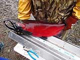 Augie slides his knife expertly up the center of the caribou.