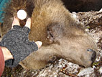 The big brown bear didn't even twitch as researcher LaVern Beier pierced its ear.