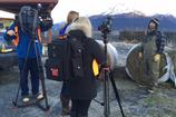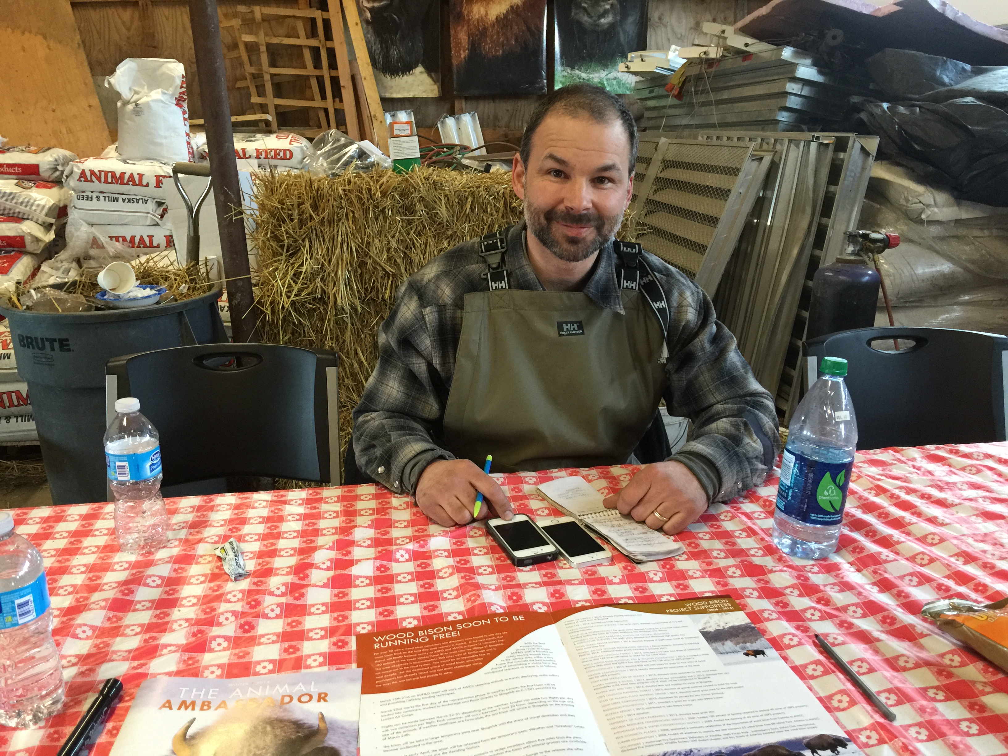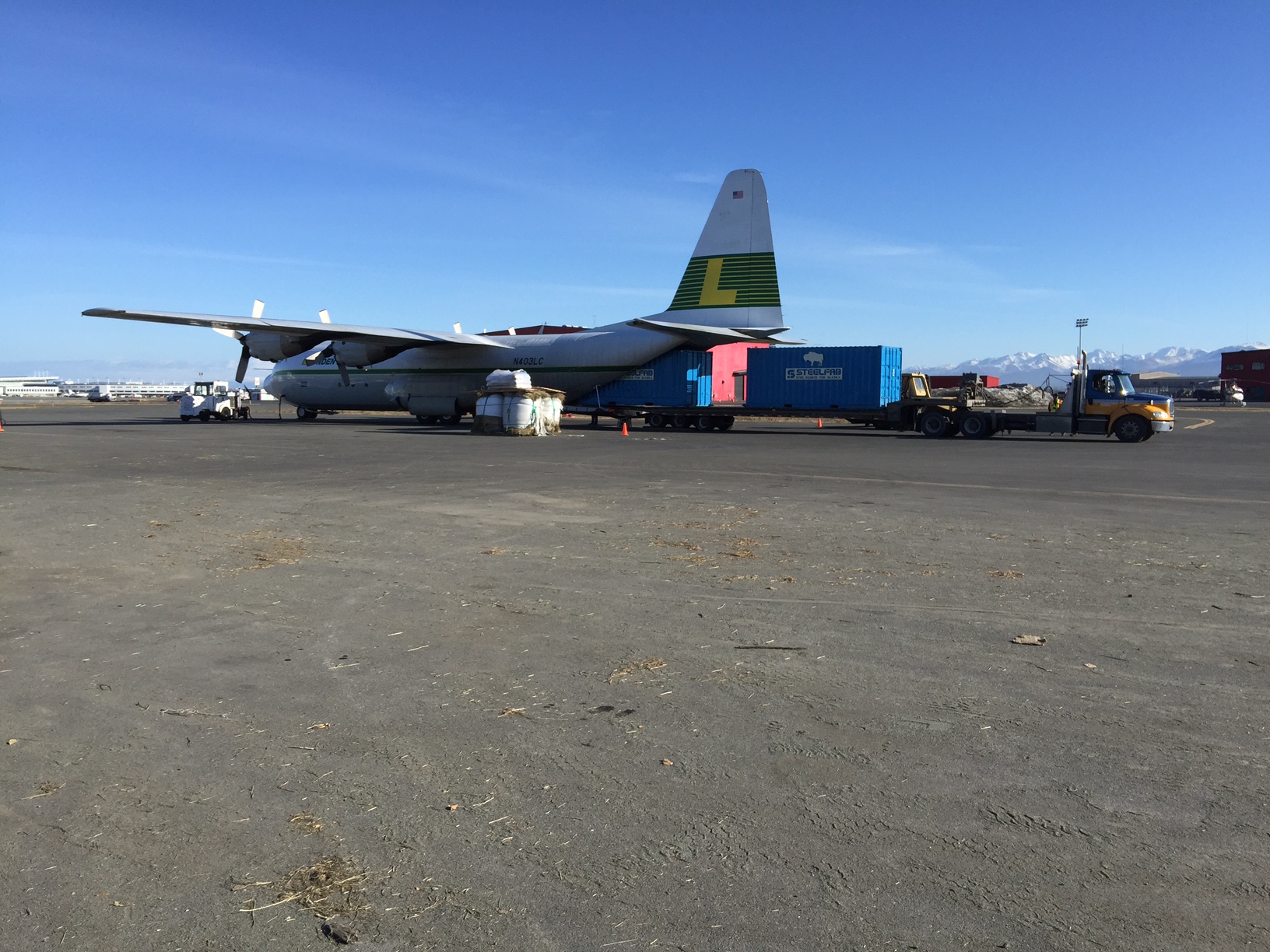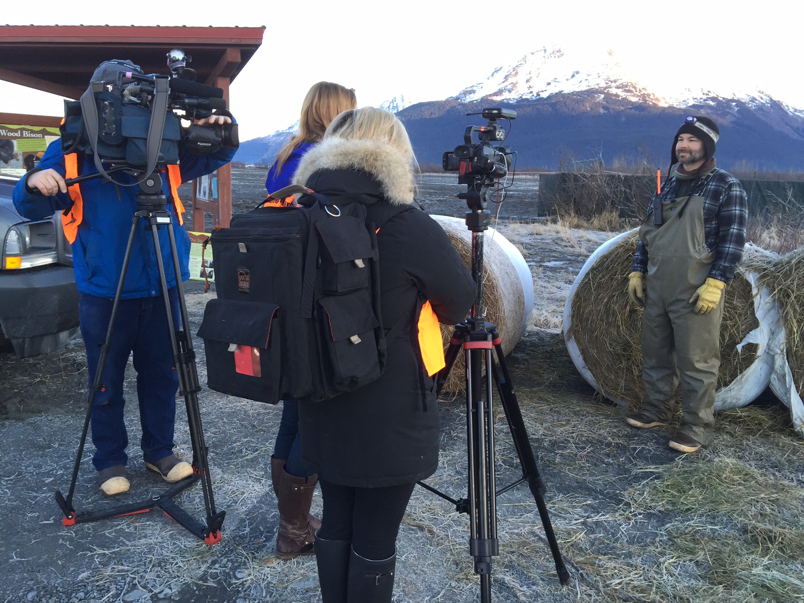 Biologist Tom Seaton is interviewed by Alaska media in March 2015 as bison are shipped from the AWCC to Shageluk. Tom Seaton coordinates the release. The big transport plane that flew the bison to the release area.