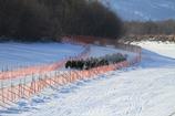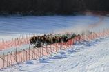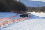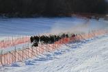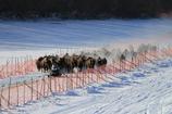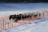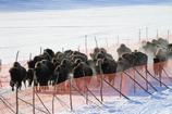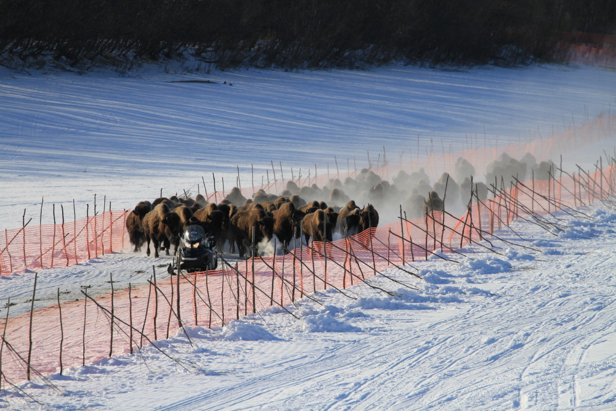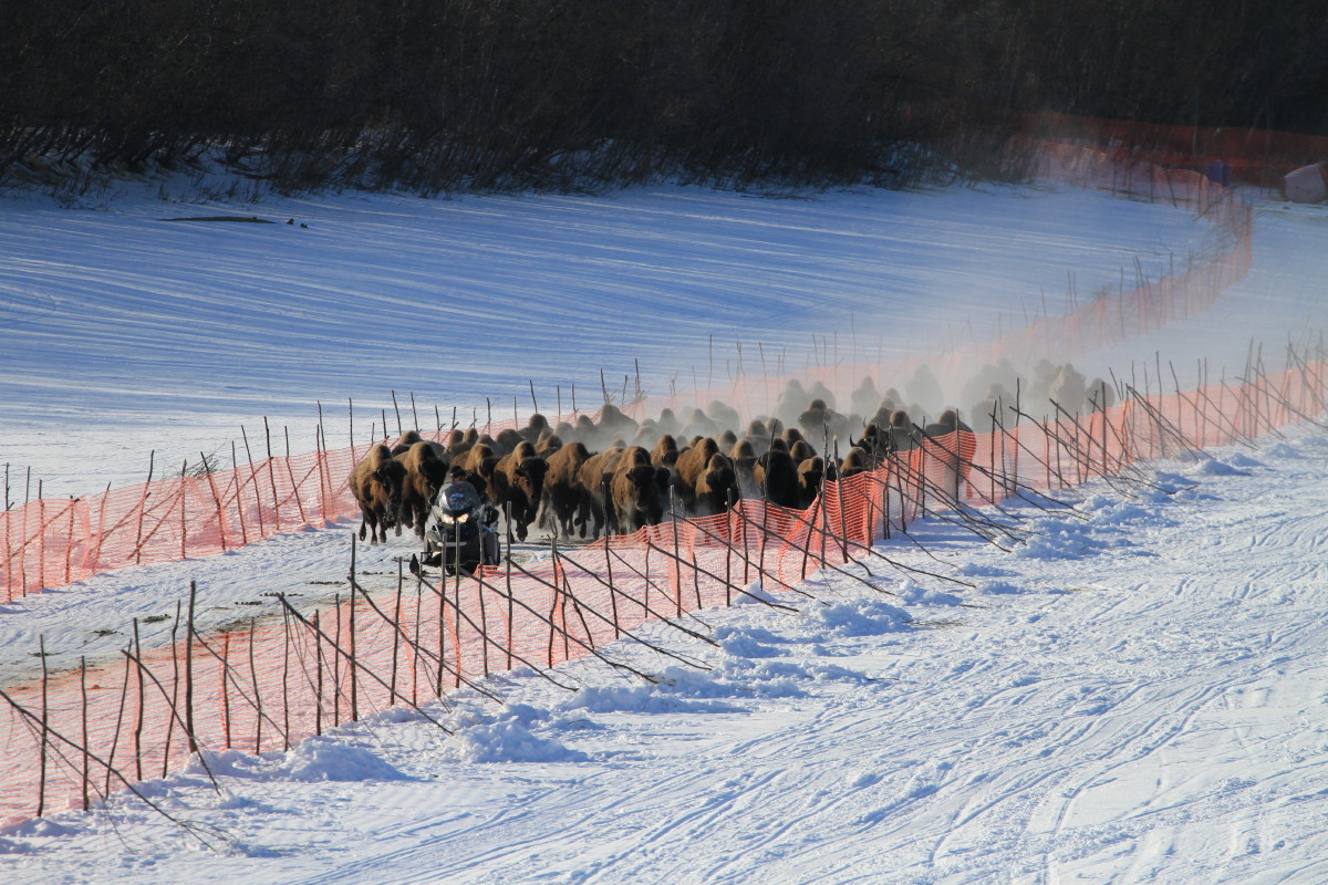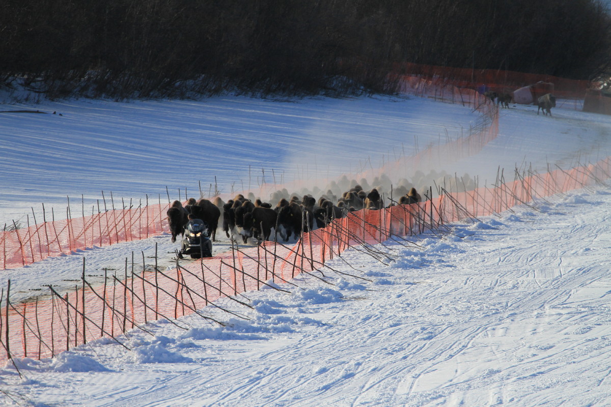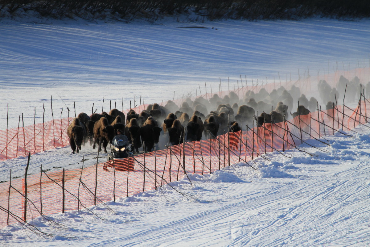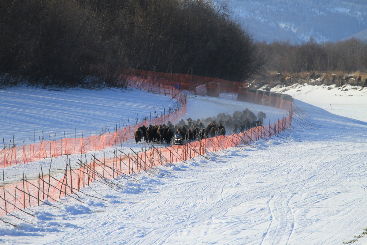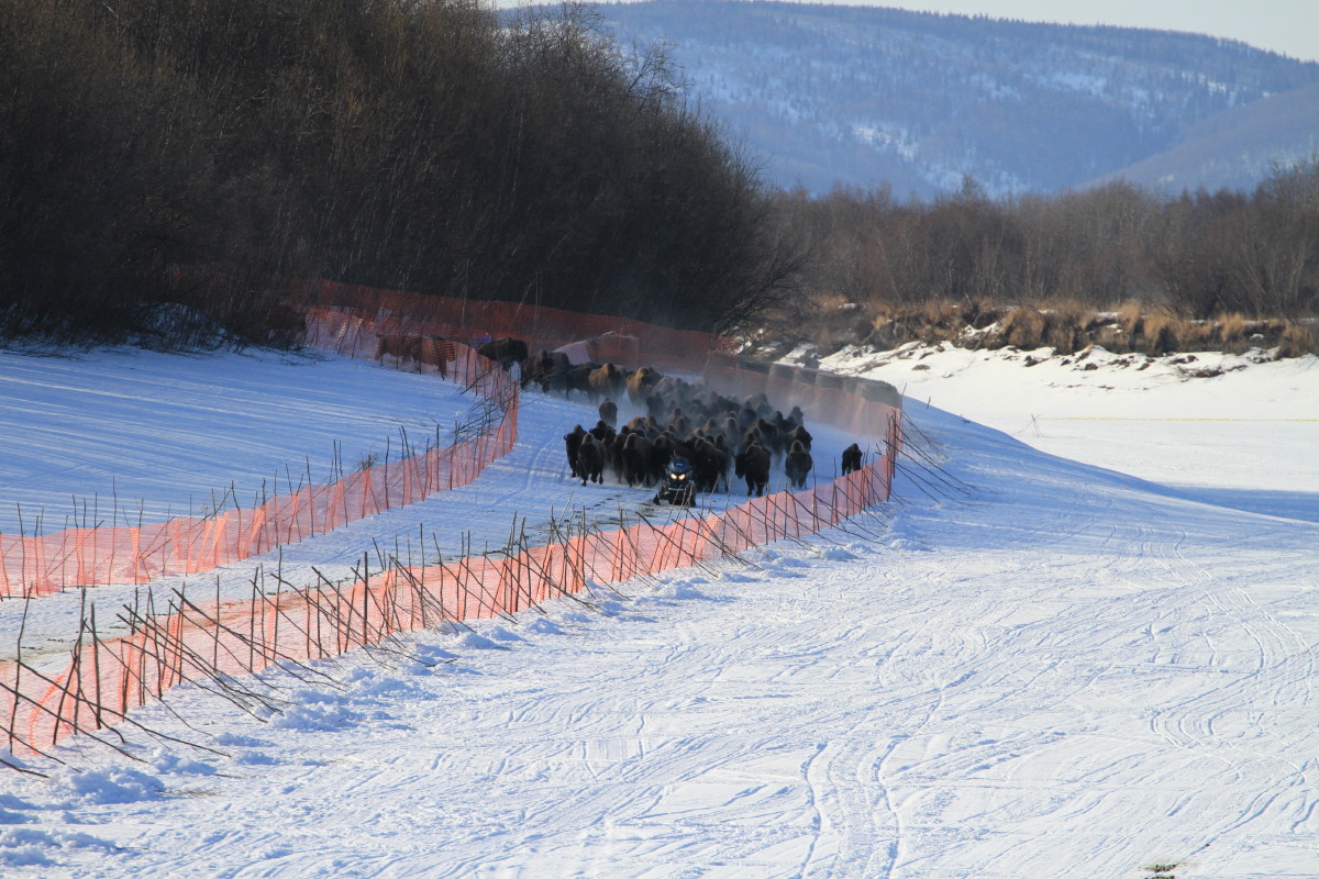 Biologist Tom Seaton leads the bison herd on a snowmachine from the staging area near Shageluk to the release site near the Innoko River.